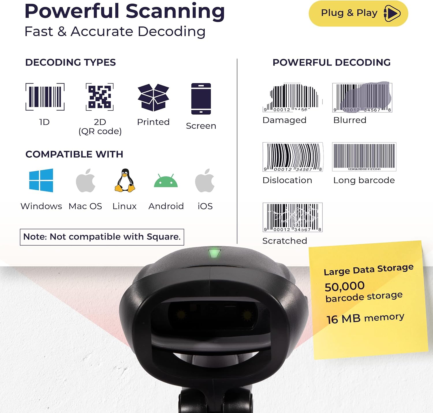- High Speed Auto Detect & Decoding Abilities - This high-performance scanner delivers lightning-fast scanning speed, decoding barcodes with precision and ease, even if they're blurry, fuzzy, moving, or broken up. Its advanced auto-detection technology and omnidirectional ability recognize and scan all major 20 and more 1D and 2D barcodes from any direction, including QR codes, Data Matrix, PDF417 , making it an ideal choice for retail, logistics, and inventory management.