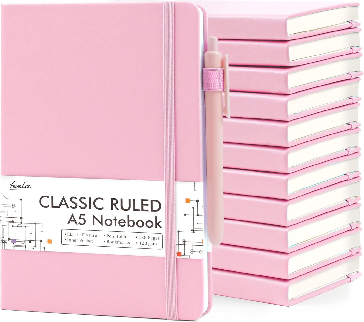 feela 12 Pack Notebooks Journals Bulk, Hardcover Notebook Classic Ruled Lined Journals with Pen Holder for Women Girls School Business Supplies, with 12 Black Pens, 120 GSM, 5.1”x8.3”, A5, Rose Pink