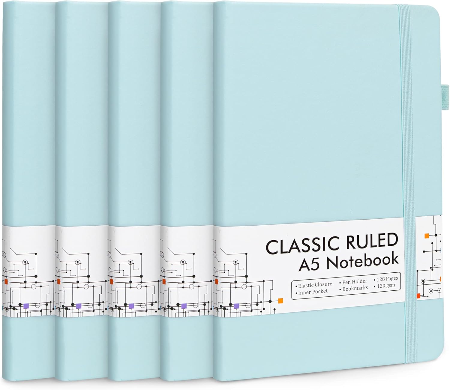 feela 5 Pack Notebooks Journals Bulk, Hardcover Notebook Classic Ruled Lined Journals with Pen Holder for Women Girls School Business Supplies, with 5 Black Pens, 120 GSM, 5.1”x8.3”, A5,Sky Blue