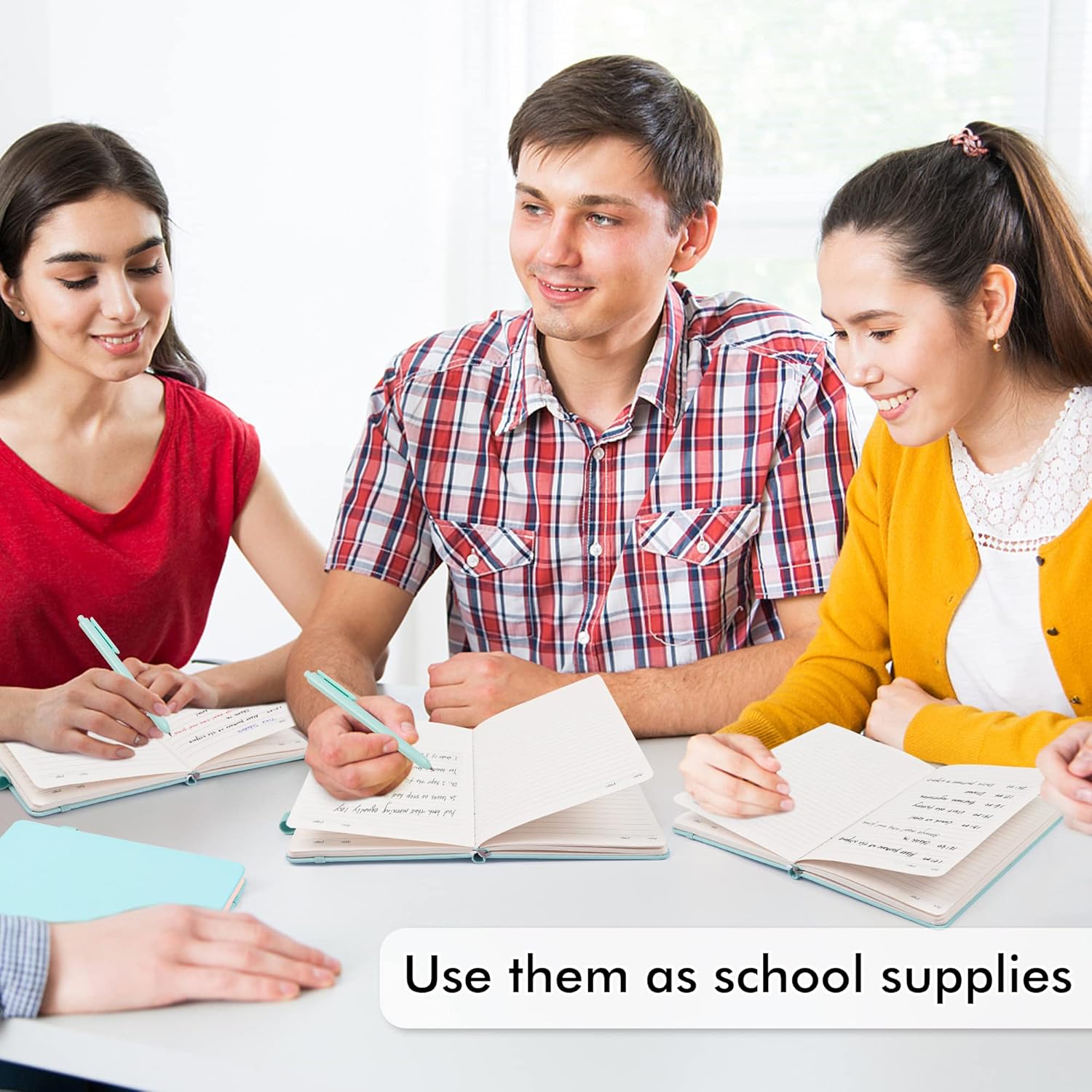 - Feela 5 Pack Classic Ruled Notebooks contains 5 sky blue ruled sturdy cover notebooks and 5 Black Retractable Pens. Each of the notebooks measures 8.3” x 5.1”, which is perfect to carry and easily held by young girls and boys. These black cute pens are customized to be placed in the pen holder, which is pretty convenient.