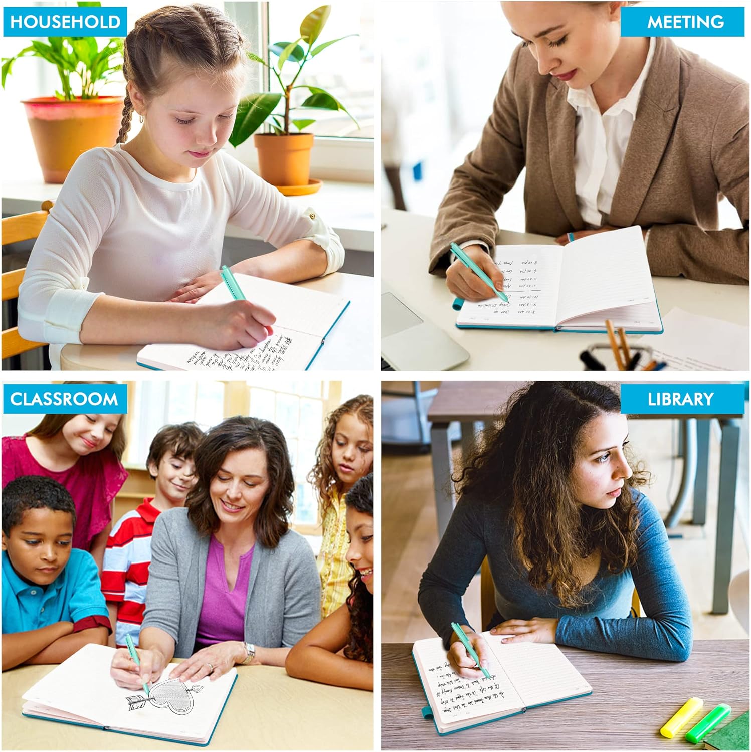 - Feela 12 Pack Classic Ruled Notebooks contains 12 teal ruled sturdy cover notebooks and 12 Black Retractable Pens. Each of the notebooks measures 8.3” x 5.1”, which is perfect to carry and easily held by young girls and boys. These black cute pens are customized to be placed in the pen holder, which is pretty convenient.