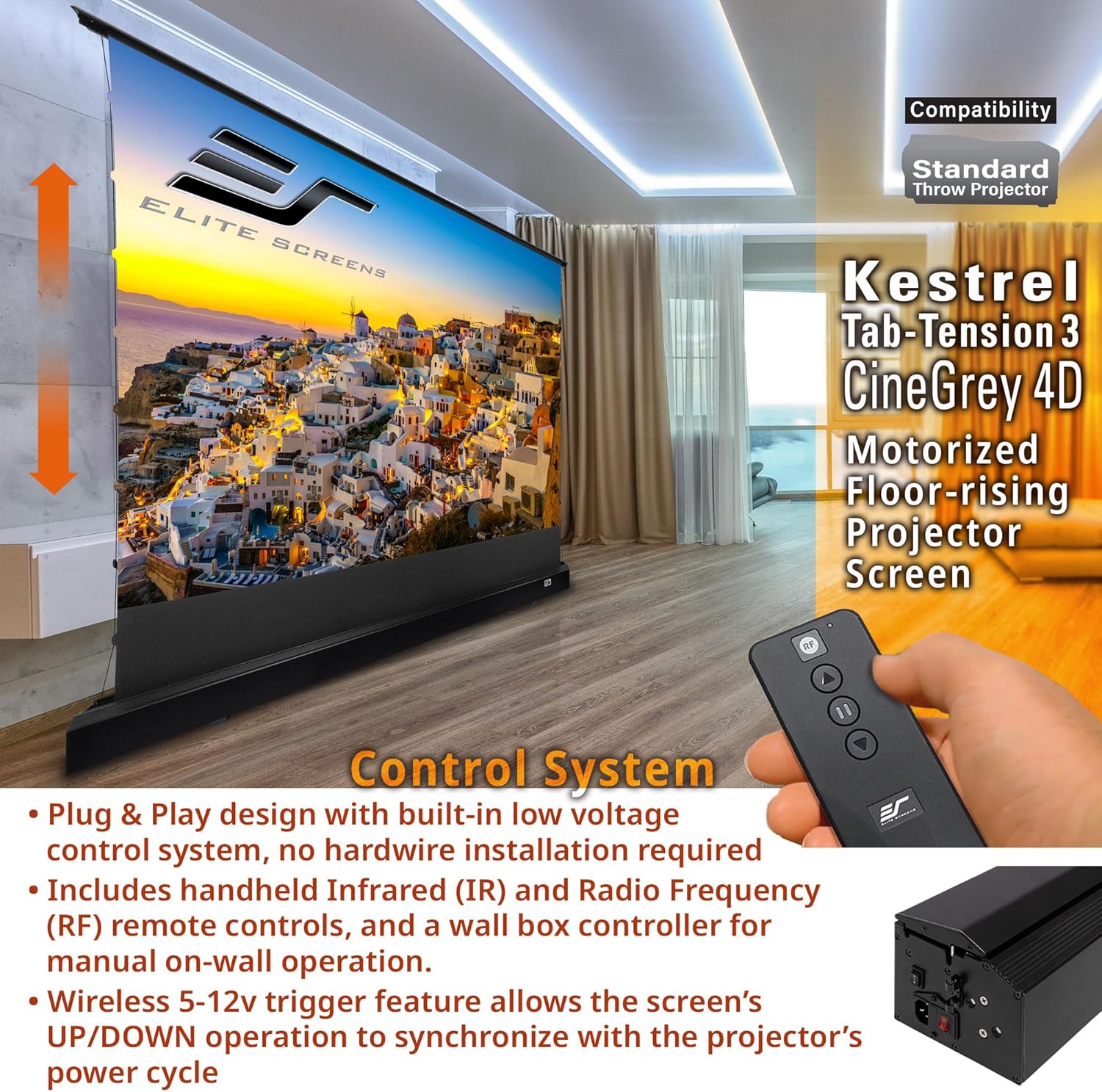 Elite Screens Kestrel Tab-Tension 3 CineGrey 4D, 150 inch 16:9, Standard Throw ISF Ceiling Ambient Light Rejecting (CLR/ALR) Electric Floor-Rising Projector Screen, Programmed Remote Kit, FTE150H3-C4D