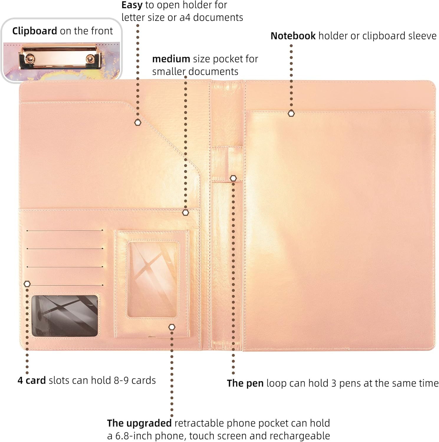 - ✔Fashion meets Functionality: Our leather portfolio folder boasts a sleek clipboard design that allows you to jot down notes or ideas on the go, and hold up to 80-100 sheets.The side straps not only keep it securely closed but also offer convenient storage for loose papers and small items. The rose gold clip adds a touch of elegance, while the removable notepad (11*8.5'') offers ultimate convenience.