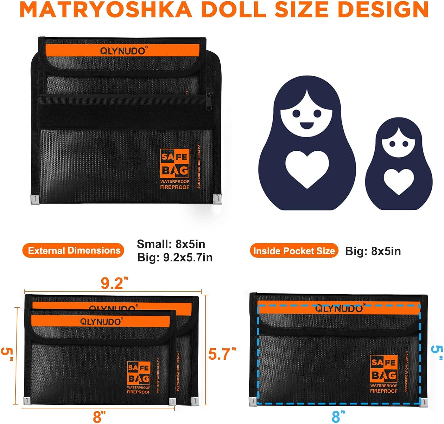 - UNIQUE PORTABLE SIZE: This fireproof money bag set comes in two sizes, an 8*5" peripheral size, and an 8*5" inner pocket size (external size is 9.2*5.7"). This combination creates an elegant balance of lightness and volume