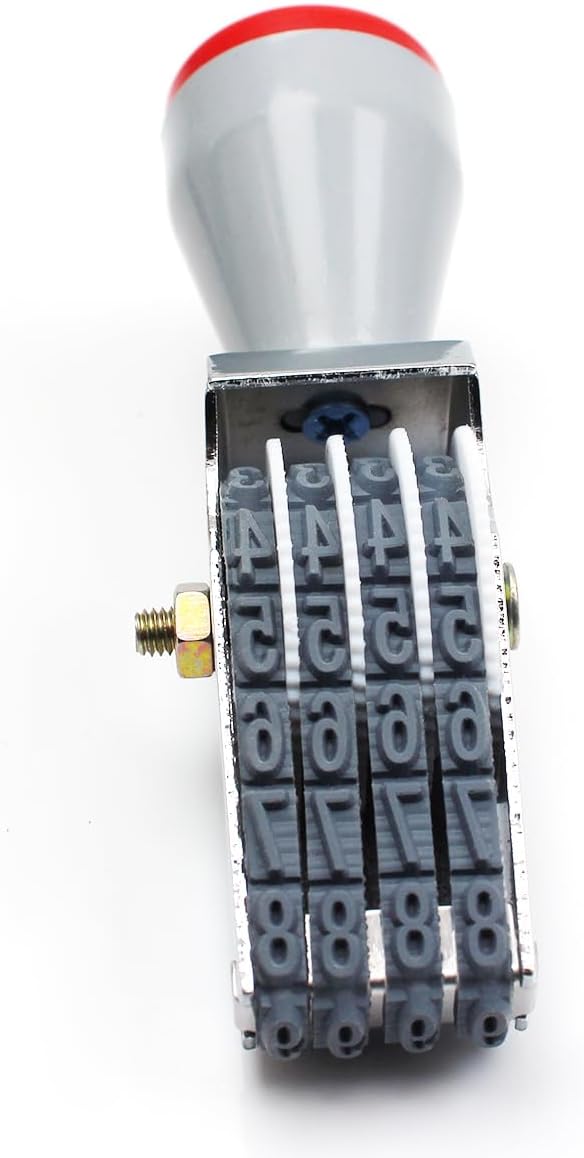- Number stamp, Material : Metal, Rubber, Plastic; Size:length :90 mm/3.54 in,width:20 mm/0.78 in,High:25 mm/0.98 in, Character : Width:3.5 mm /0.13 in,Height:7 mm/0.27 in, Color : Gray black, Weight: 42 g, Package Content : 1 X Numbering Stamp ( (ink not included, an additional ink pad is required when using).