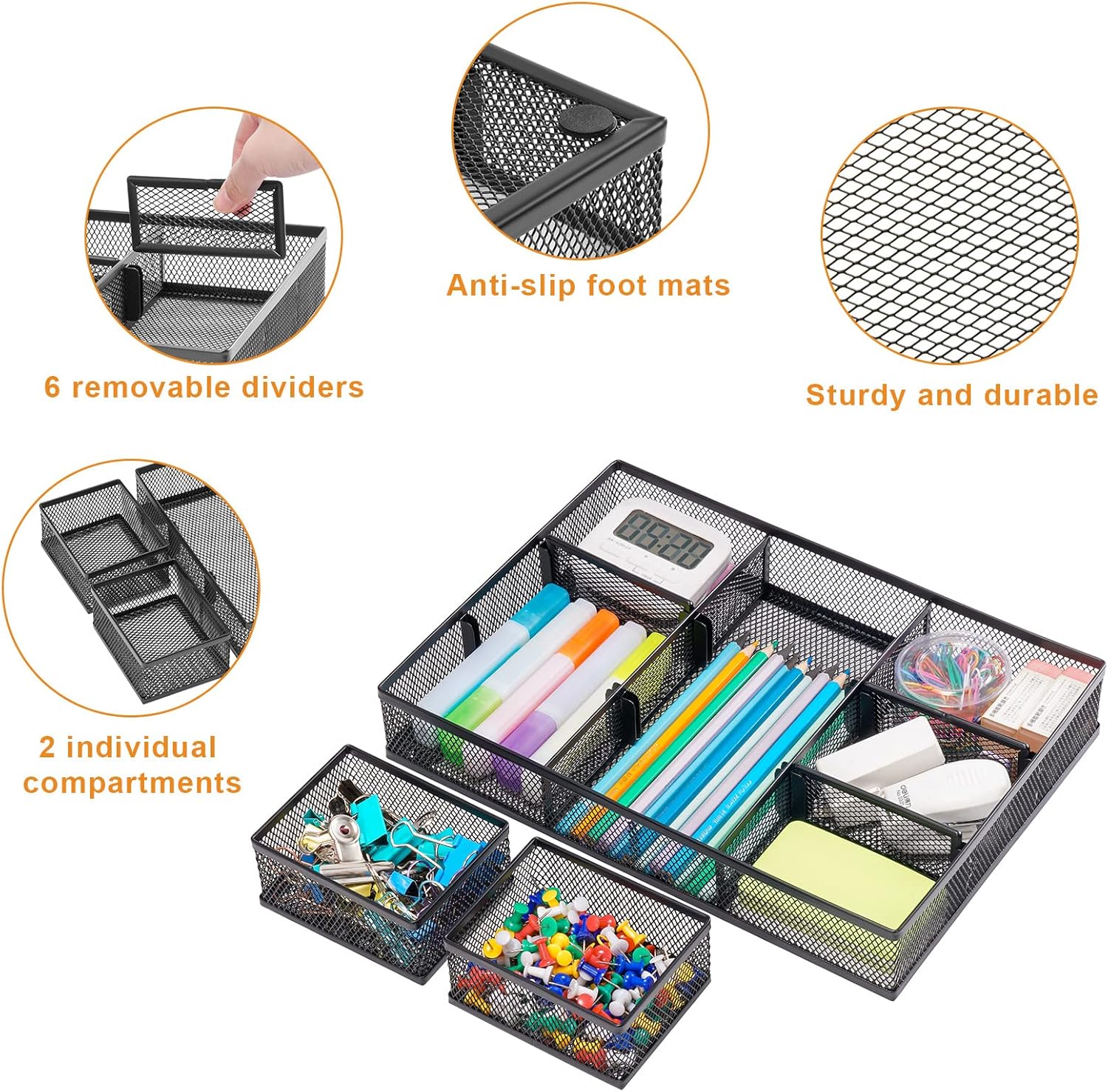 - 【Stury and Durable】Made of sturdy black wire mesh structure with powder coated surface, smooth and corrosion-resistant. Non-slip feet can keep the product stable.Big Drawer:12*8.3*2.2inches;2PC Small Drawers:3.5*3*1.9inches