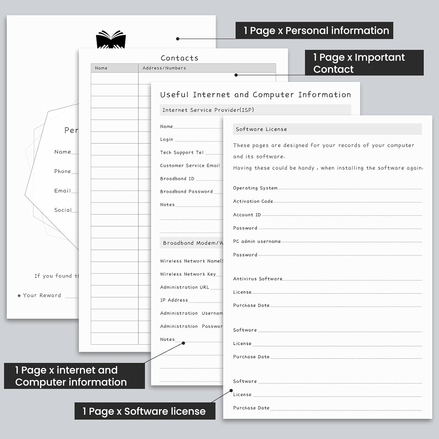 - 【Alphabetical A-Z Tabs】The alphabet label system makes it convenient to record the passwords you need. Logs also have room to write important data, wireless and email settings, software license information, and additional notes. It provides separate pages for your most important websites, so you can access them quickly.