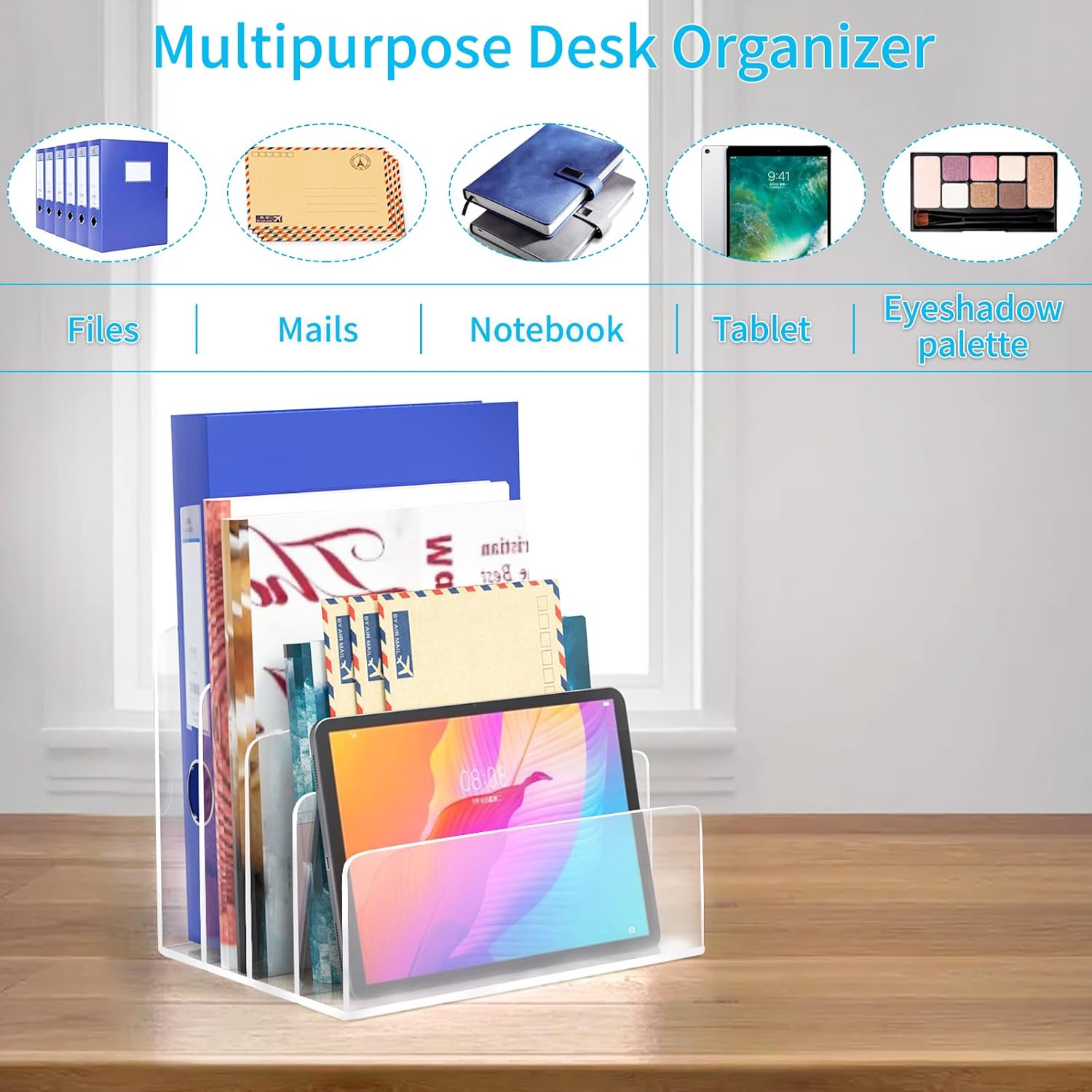 - ⏩【Multipurpose Acrylic Desk Organizer 】 - Size: 6.8"H x 6.9"L x 8.9"W. Our 4 section file sorter is perfect for you to organize file folders, mails, letters, books, and other documents. It also can hold makeup eyeshadow palettes on vanity and electronics (ipad, laptop, phone) while charging.