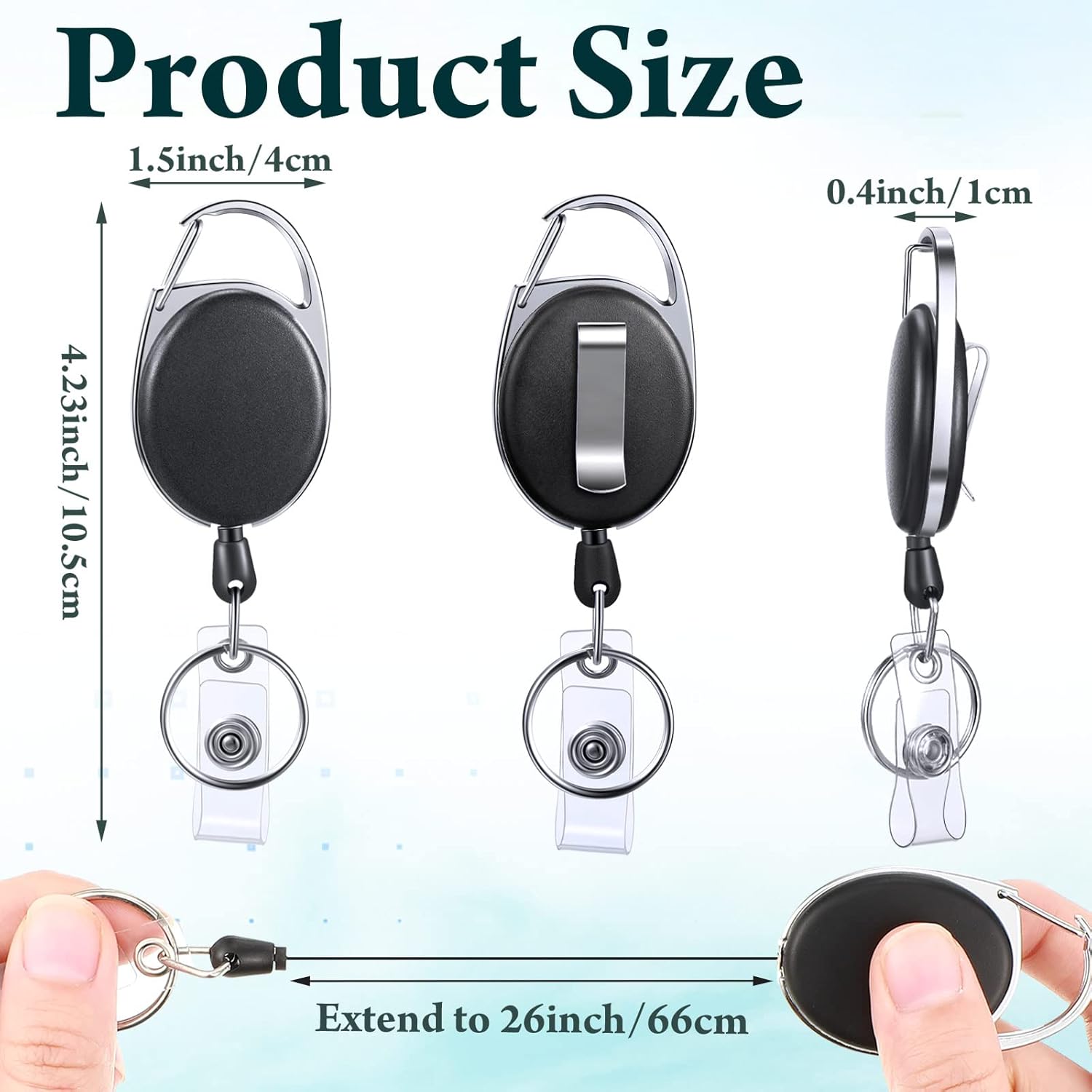 - Product Size: heavy duty reel clip measures 4.23 x 1.5inch, designed with a retractable cord which could extend up to 26 inch long; The length is suitable for use in everyday activities without worries of tangled ropes