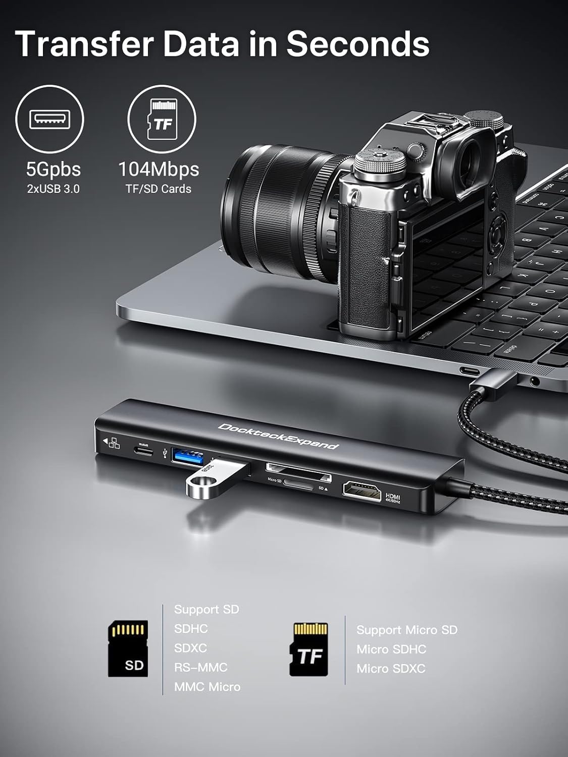 USB C Hub Multiport Adapter, DockteckExpand USB C Dongle 7 in 1 with 4K 60Hz HDMI Port, 1Gbps Ethernet, 100W PD, 2 USB 3.0 Ports, SD/TF Card Reader for MacBook iPad HP Dell XPS and More