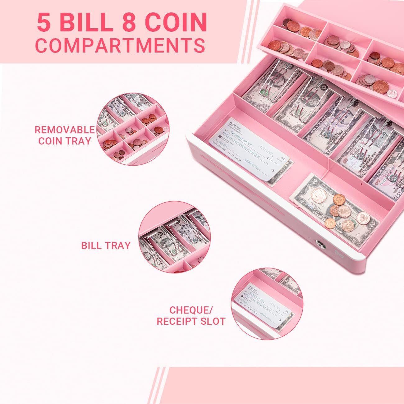 - Secured with 3 Position Lock: Our cash box with money tray and lock has a 3-position key lock: 1-Auto open by printer/driver, 2-Manual open by key, 3-Lock. Perfect cash register for businesses. Our package includes 5 keys for additional backup.
