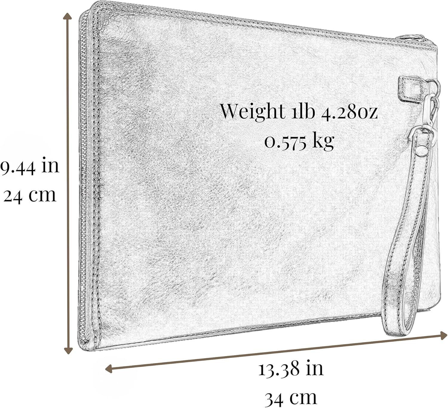 - ✔️ DESIGNED FOR COMFORT: The leather clutch has a detachable wrist strap – perfect for a day on the go. 1 compartment with a divider is more than enough to accommodate your wallet, smartphone, keys, etc. DIMENSIONS: Height: 9.44 in (24 сm); Length: 13.38 in (34 cm); Weight: 1 lb 4.28 oz (0.575 kg).