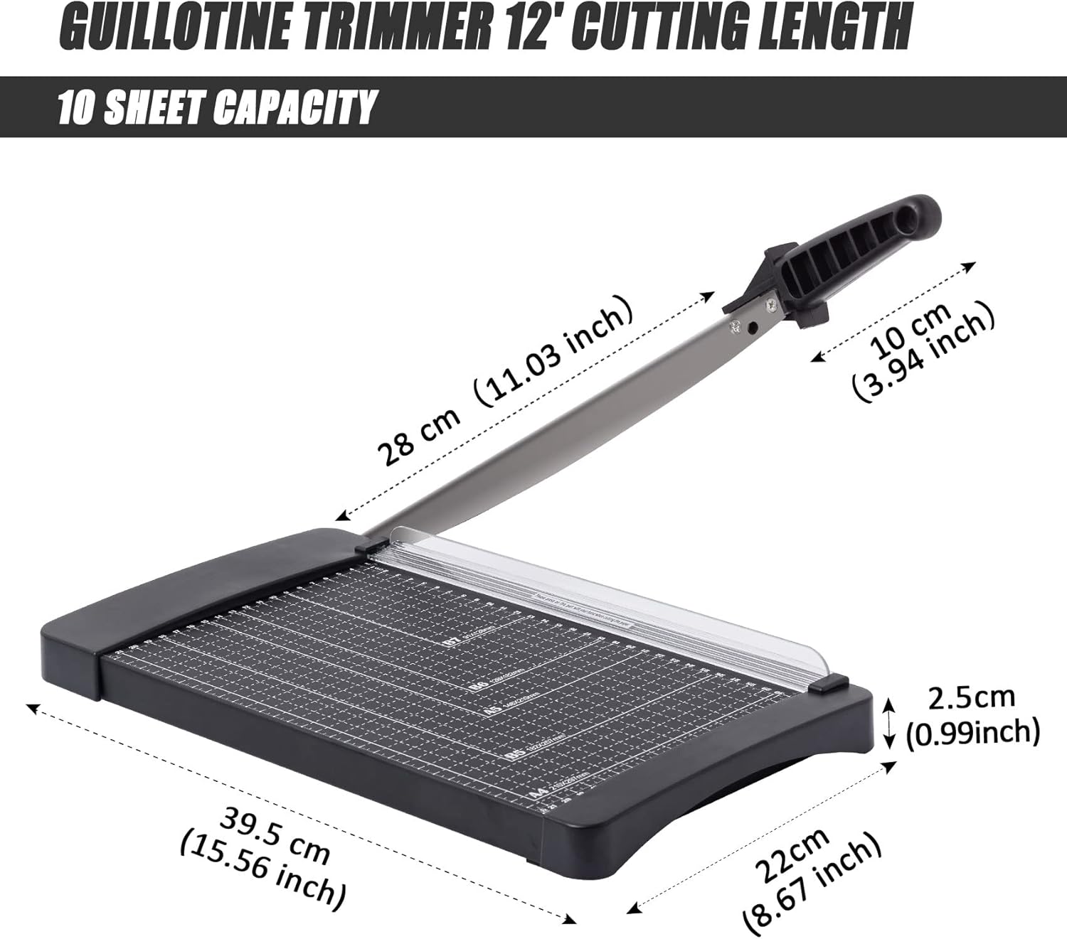 - Cutting Capacity 8 To 10 Sheet : The guillotine trimmer easily cutting paper 8 sheets one time; After texting 10 sheets or more will take more effector for cutting and cause raw edge inch and centimeter markings for seamless cutting