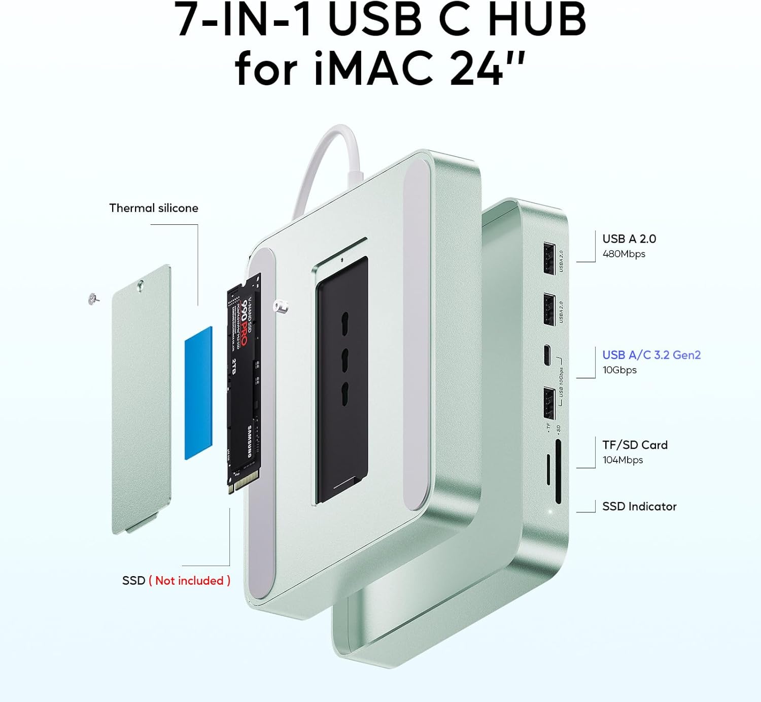 USB C HUB for iMac 24 inch 2021/2023/2024, USB Hub Adapter iMac Accessories for iMac M1/M3/M4 with USB C 10Gbps 3*USB A SD/TF, Docking Station Support Expand M.2 SSD (Not Included), Green