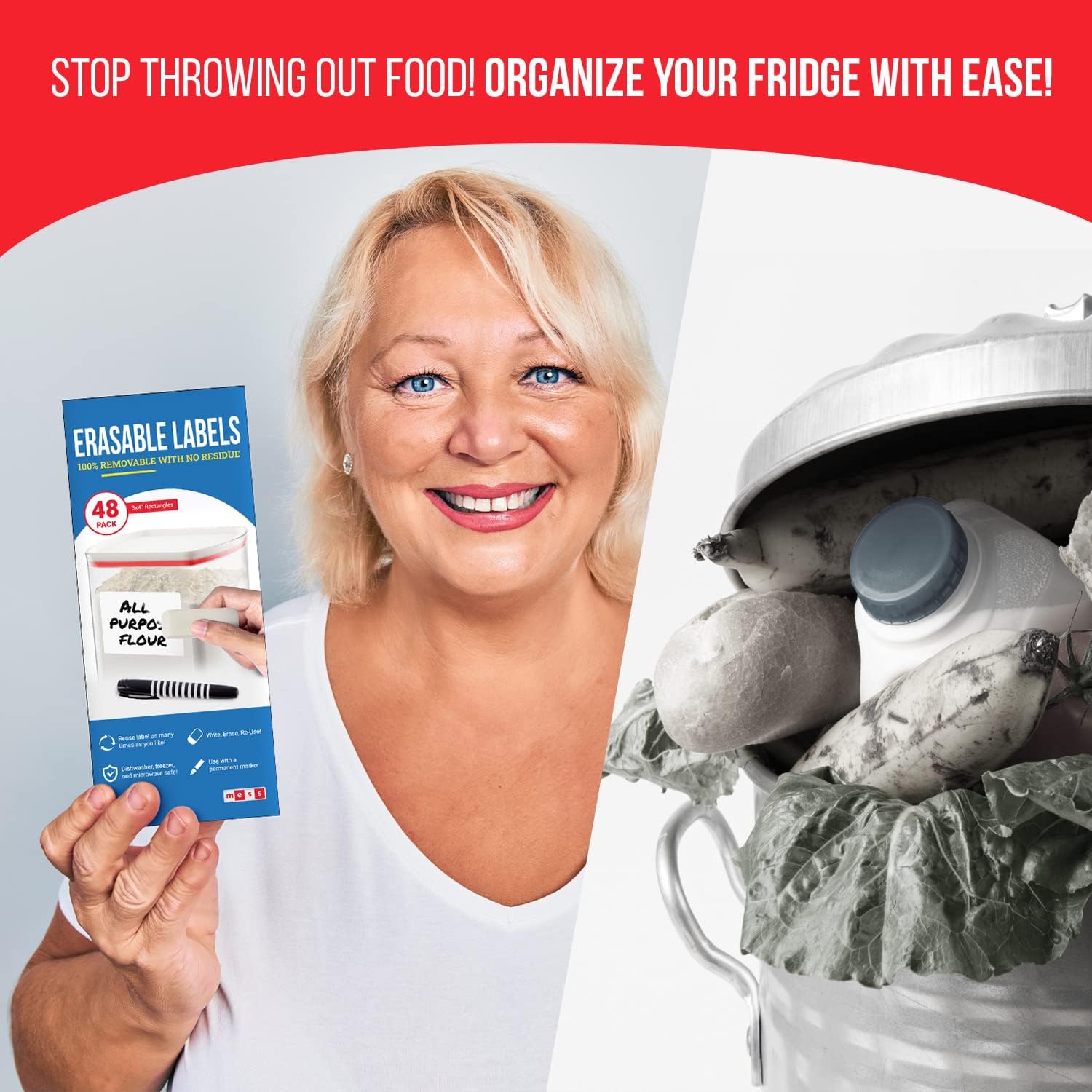 - Multipurpose – Your erasable and removable blank stickers work great for labeling meal prep containers, canning labels, mason jar labels, or organization in the fridge. Way better than freezer tape! Eraser and Marker not included. Help the Environment – Accurate labeling helps keep old fridge food, drinks, and containers out of the landfill. These kitchen labels for containers also keep harmful cleaners out of the drain!