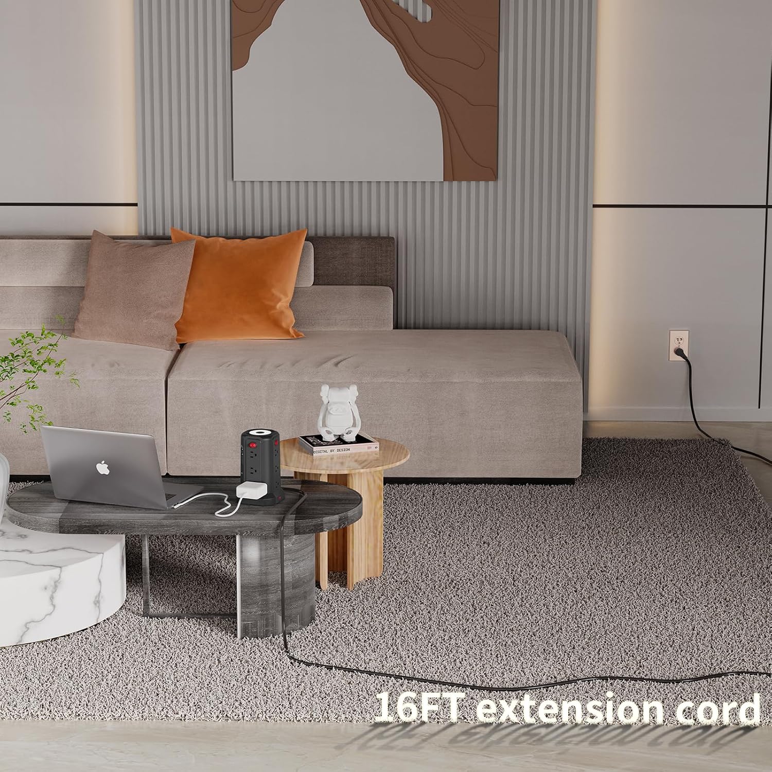 - 16 Feet Extra Long Extension Cord: This multiple outlets charging tower power strip has a 45° flat plug and 16 ft long cord. The long extension cord cable is flexible enough that can fit easily into hard-to-reach places behind your bed or sofa in a long distance.