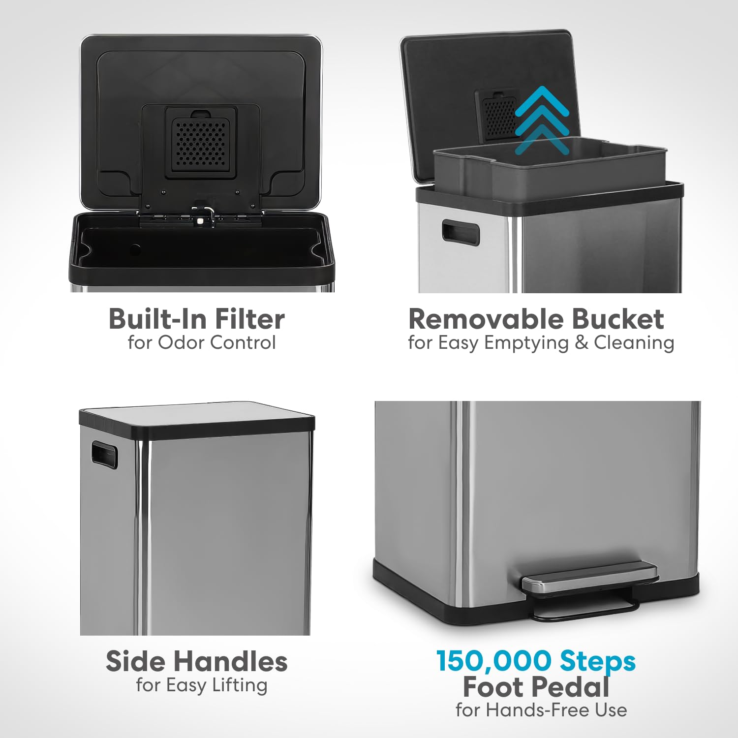 SIMPLI-MAGIC 50 Liter / 13.2 Gallon Soft-Close, Smudge Resistant Trash Can with Foot Pedal and Built in Filter- Stainless Steel, Sleek Finish