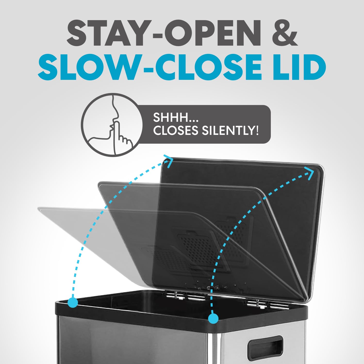 - Quiet-Close Lid: Lid closes quietly and gently without slamming. Hands Free and Fingerprint Proof: Hands-free operation with durable a metal foot pedal and fingerprint-resistant stainless steel finish leads to your trash can staying cleaner longer
