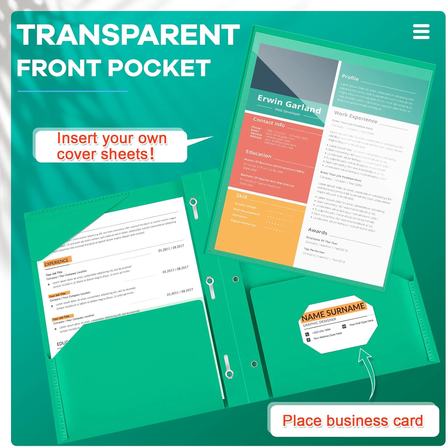 - Practical and Useful: with a clear front pocket, you can put your catalog, tables, favorite reports, presentations and more for clear display; Each plastic folder has 2 internal pockets to help organize and store your letter sized paper and documents; There are also 3 prongs to secure your 3-hole loose leaf paper in case it falls, and the card slot can hold your ID card or business card, practical for your daily work