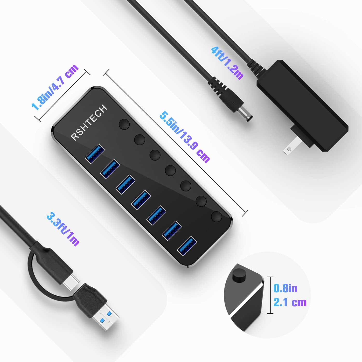 Powered UBS Hub, RSHTECH 7 Port USB 3.0/USB C Hub Upgraded Version Aluminum USB Splitter with 2-in-1 USB Cable,5V 3A Power Adapter and Individual Switches, USB Port Expander for Laptop/PC, RSH-ST07