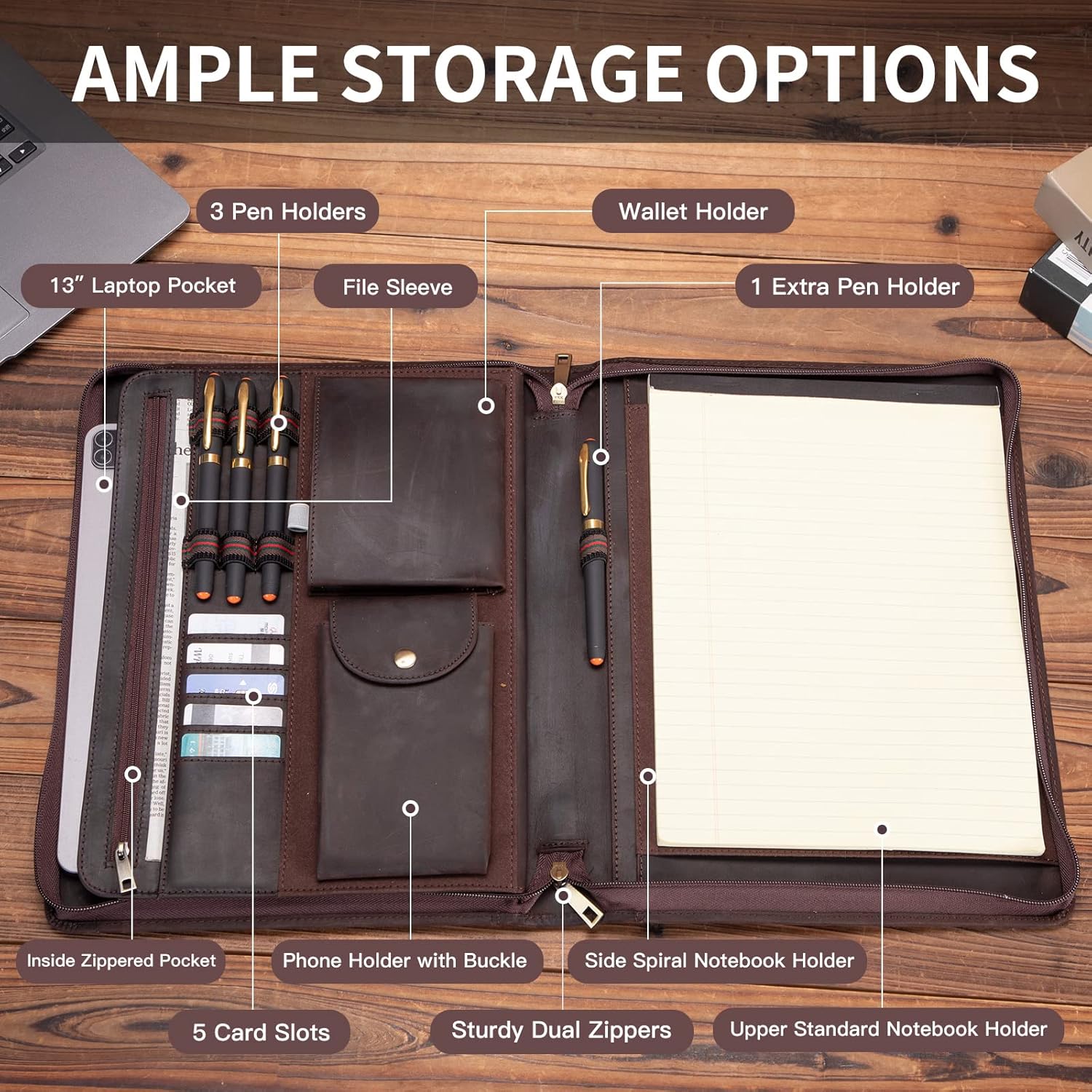 - Functional Storage: Side spiral notebook holder and upper standard notebook holder. Phone holder with buckle, wallet pocket, 4 pen holders, 5 card slots and inside zippered pocket. In addition to the exterior pocket, the inside 13” laptop pocket is large enough for a 13” laptop or 13.3” MacBook Pro (Not for 13.3” MacBook Air).