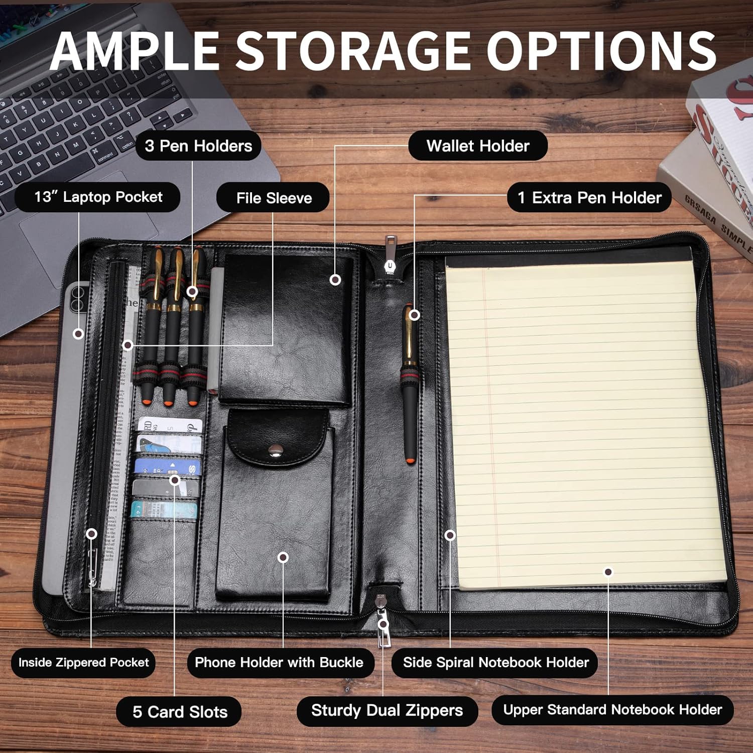 Vegan Leather Portfolio with Front Pocket for Men and Women, Zippered Padfolio Binder 8.5 x 11 Legal Pad Notebook Holder, Fits 13” Laptop, Professional Work File Case, Black