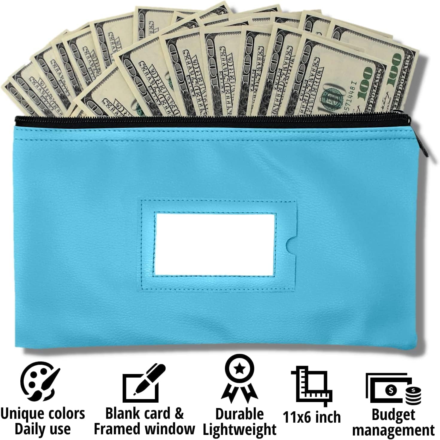 Money Bank Deposit Bag with Zipper | 11x6 inch | Light Blue | Durable Leatherette Money Cash Coin Check Wallet Pouch for Men & Women with Framed ID Window and Blank Card | by GIDABRAND (10)
