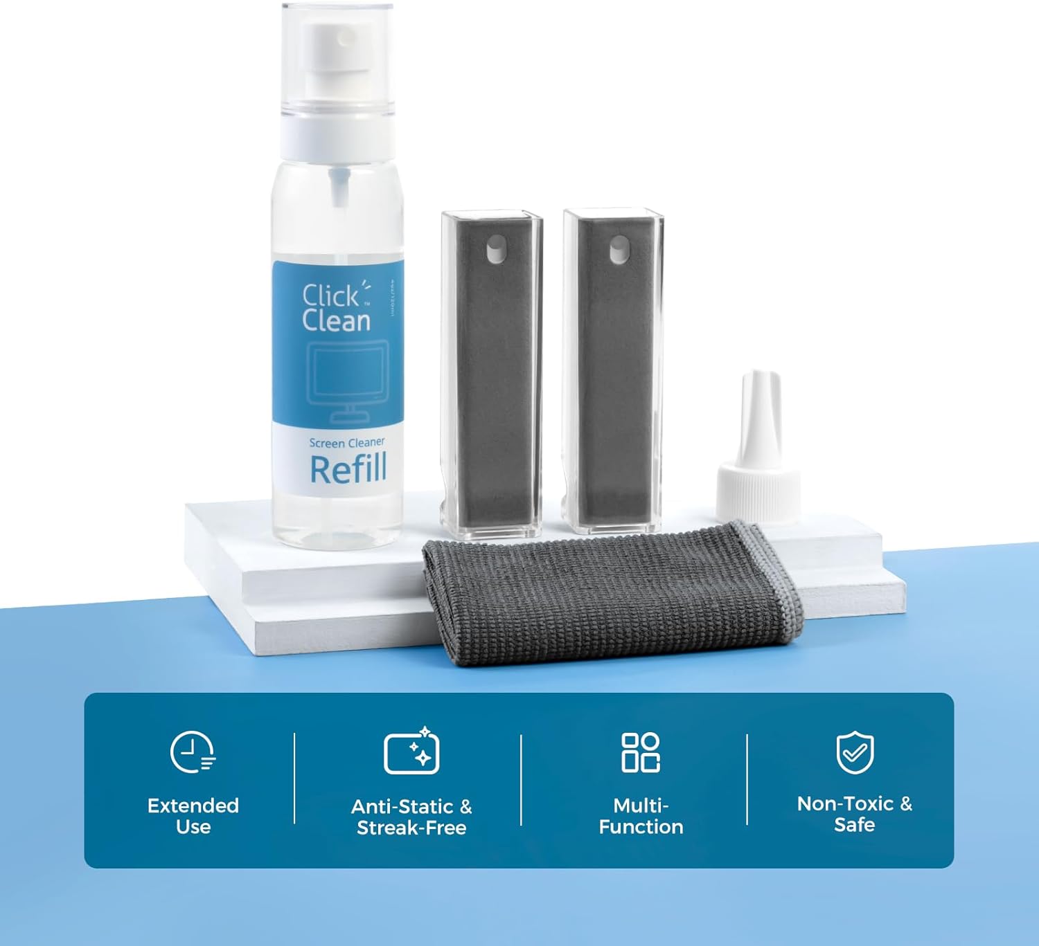 Click Clean Screen Cleaner Kits - 2 All-in-One Mist Cleaner with 4 oz Refill, 1 Microfiber Cloth(7.8 x 7.8in), 1 Mini Funnel, and 1 Sprayer - for All Phones, Laptop and Tablet Screens