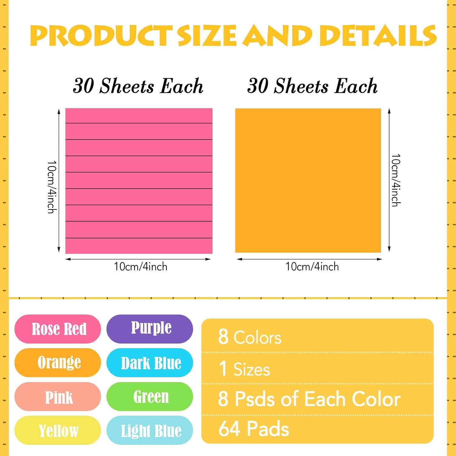 - Abundant Quantity: you will receive 64 pieces of sticky notes in 8 bright colors, which come in 2 designs, one is lined, one is blank, they are designed with lines for writing neatly, abundant quantity fits for your daily use and replacement needs
