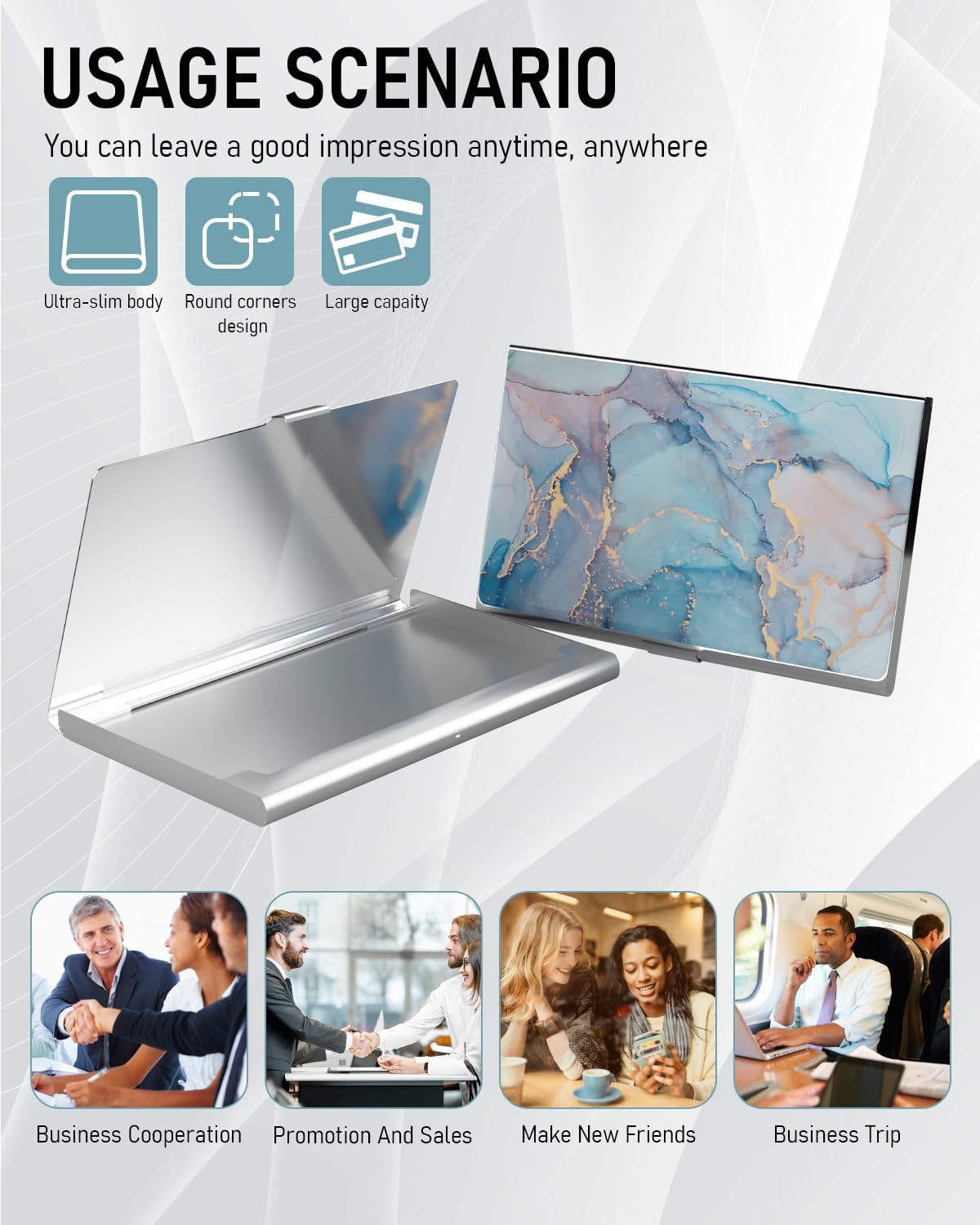 Business Card Metal Slim Organizer, Professional Stainless Steel Square Pocket Wallet for Office Workers, Compact and Portable for Pockets (Blue Marble
