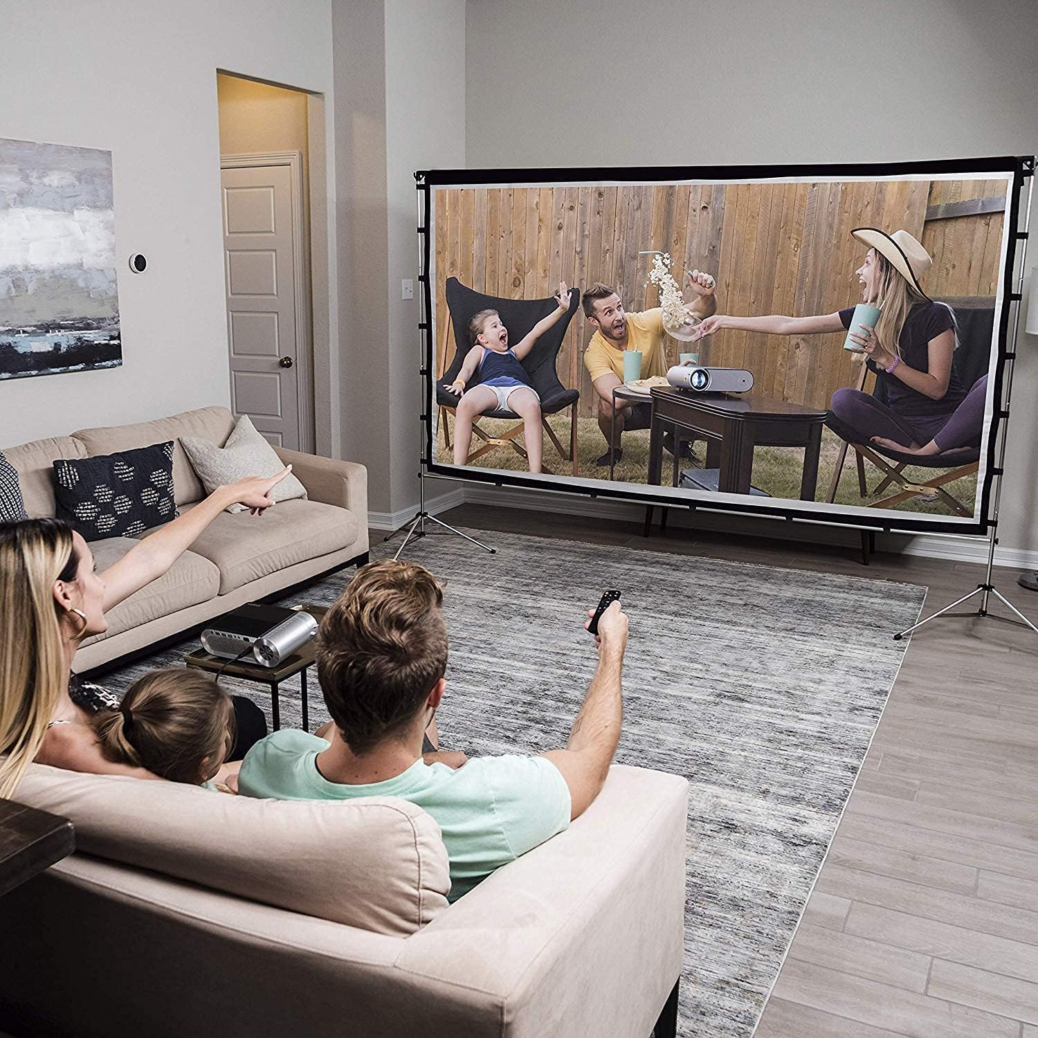 - [Excellent Projection Display]- 120-inch outdoor projector screen with stand, 16:9 aspect ratio, and 160 degrees wide viewing angle. The Vamvo portable projector screen will become your best friend. The movie screen is designed to provide clear, high-resolution images, rich colors, and an excellent viewing experience in different viewing positions. When using it, you'll feel like you're in a movie theater whether you're by yourself or sharing a fun time with family and friends.