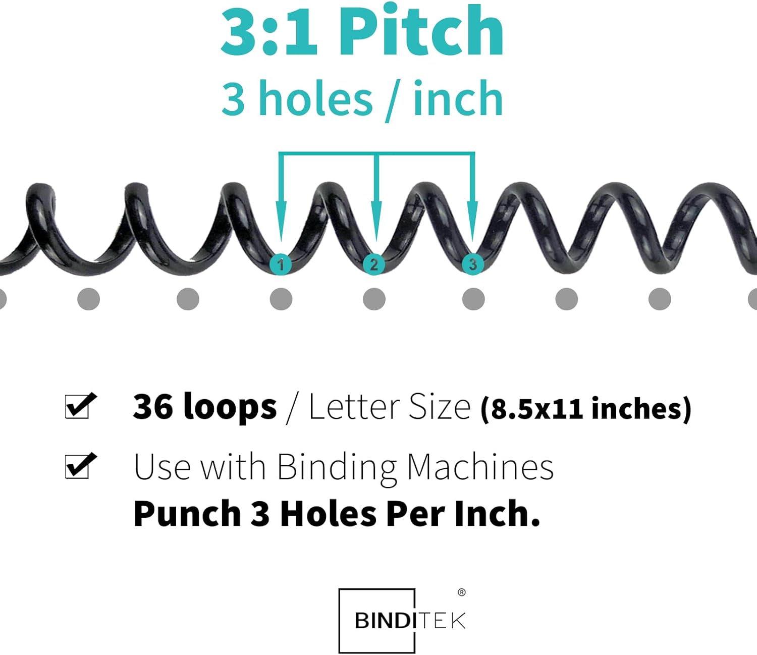 - 【3:1 Pitch & 36 Loops】These spiral binding coils have a 3:1 pitch, meaning they work with any binding machine that punches 3 holes per inch. They are ideally compatible with Binditek spiral binding machine.