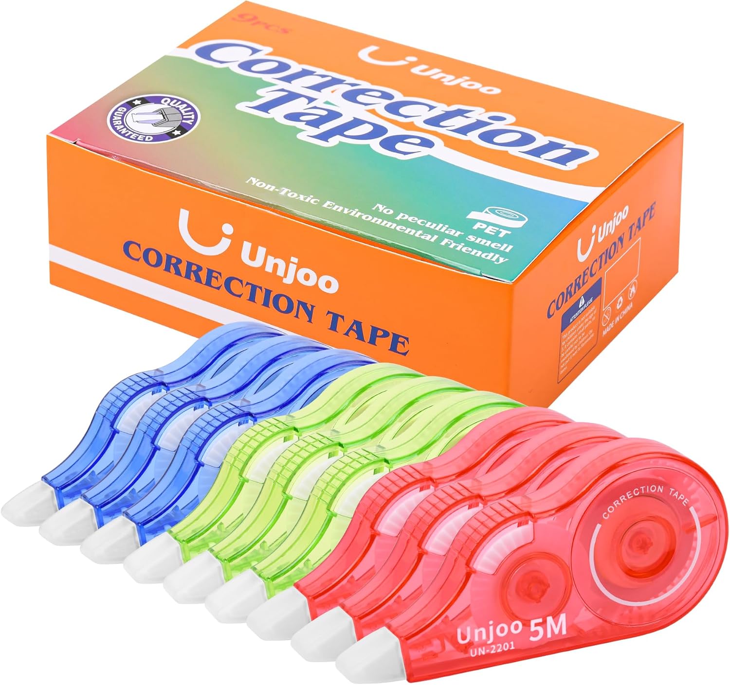 White Correction Tape, Easy To Use Applicator, Fast Clean Tear-Resistant Tape For school Supplies, Office (9-pack, 5M/196, Red, Green, Blue, Tape Width 0.2in)