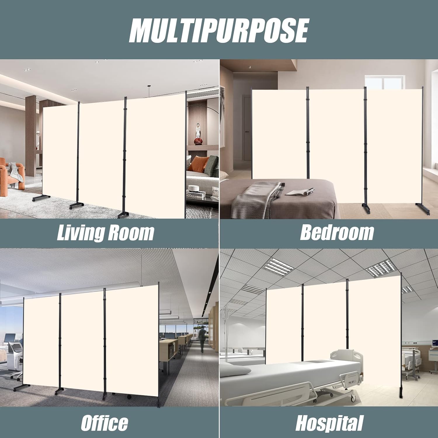 - Movable Quiet & Smooth: Our Room Dividers equipped with 15.75 inch/40 cm steel casters and 8pcs PE universal wheels, which allow you to move it anywhere easier. We also added 4 brakes for each leg, and you are free to let it pause to prevent it from sliding to improve the stability of the privacy screen. The 3 Panel Wall Divider Size: 102''W X 72.2''H, Each Panel Size: 34''Wx72.2''H