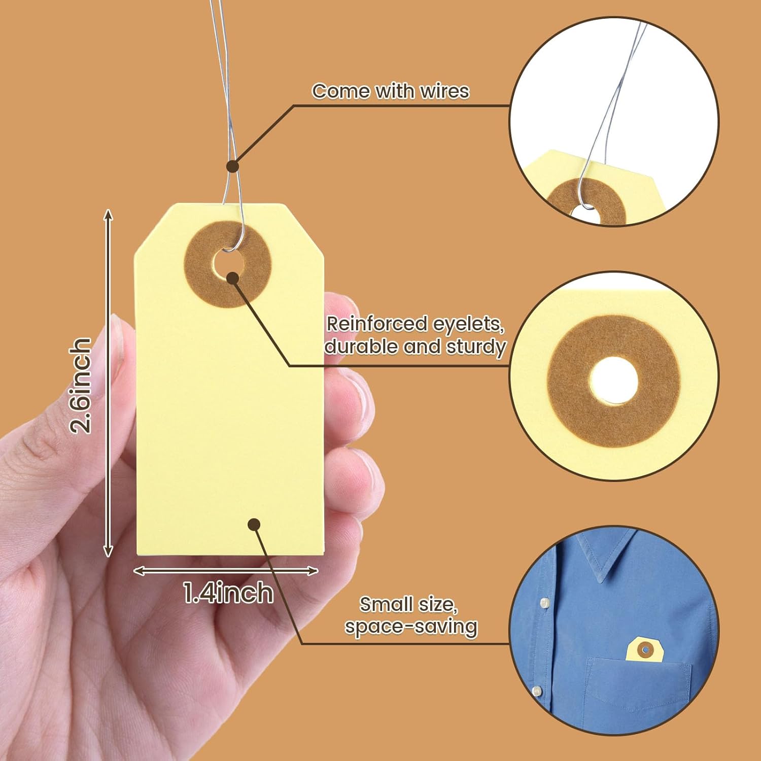 - What’s Included: 100PCS yellow small shipping tags and 100PCS metal wires, measuring 2.75"x1.37". These tags provide ample quantity for different purposes, improving organization and efficiency