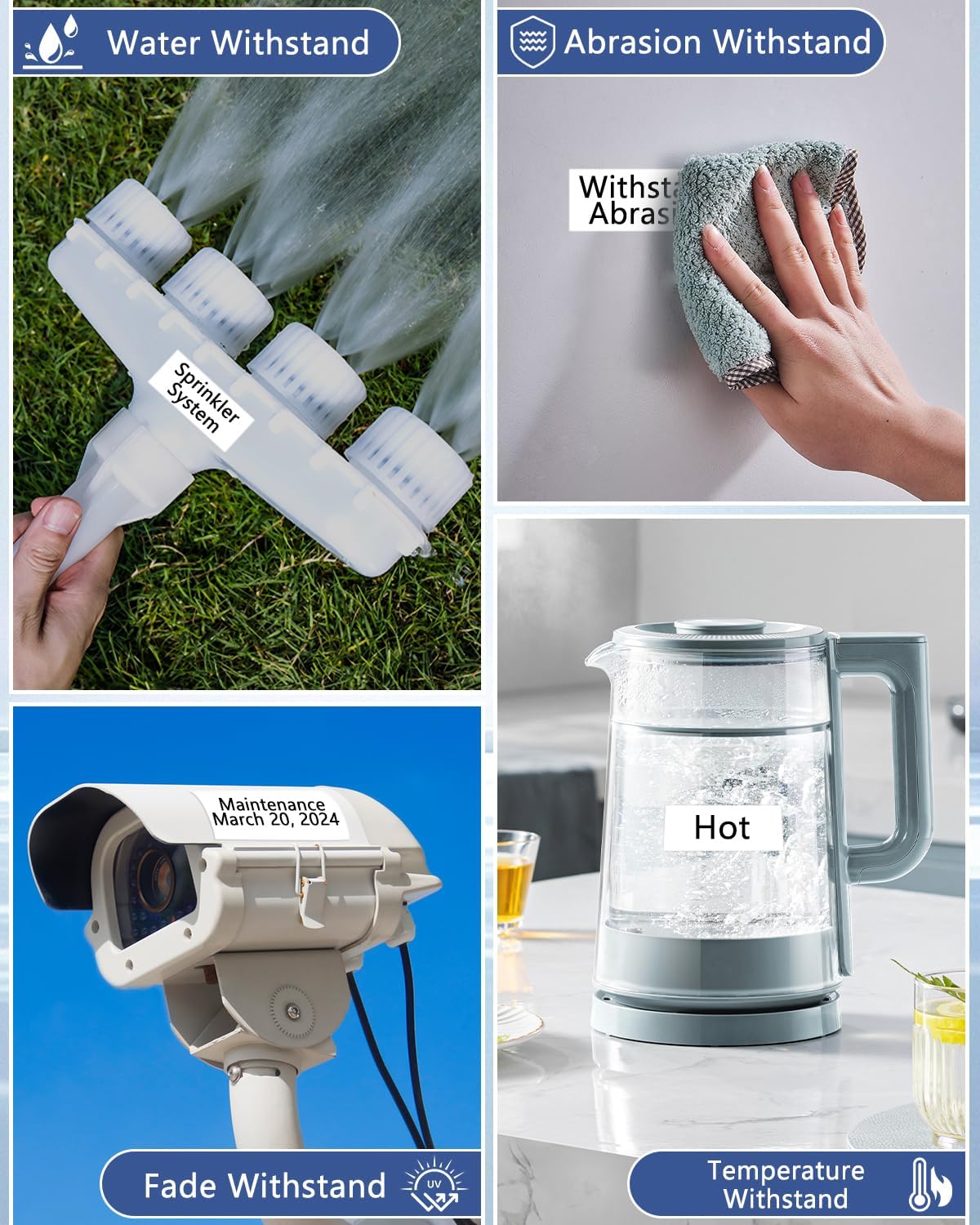 - Features: The laminated layers of label tape make it fade-resistant, Tear resistant Water Resistant and Chemical Resistant. Strong adhesive ensures the label stays in place and does not peel off over time.