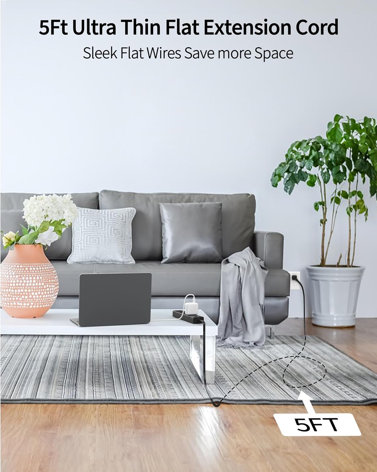 - 【Maximize Your Space】 - Ultra thin flat plug with a slim 0.33-inch profile and 45° right-angle design, thinner than an Apple phone. Our power strip fits easily behind furniture and won't block other outlets. Good for dorm rooms, home offices etc.