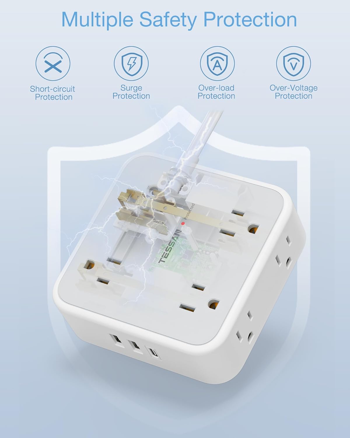 - Multiple Outlets: 8 widely spaced outlets provide ample space for multiple devices and adapters to be plugged in simultaneously without blocking adjacent outlets.3 USB chargers, including 1 USB C port, allow for convenient charging of smartphones, tablets, and other USB-powered devices without the need for additional adapters