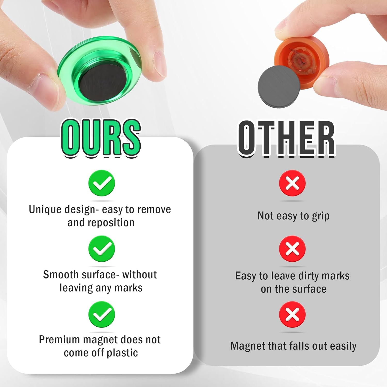 - 【Unique Design】Our magnets have a circular shape that make them easy to remove and reposition. Their unique design ensures that they can be easily moved and reused without leaving any marks on metal surfaces, such as refrigerator and white board.