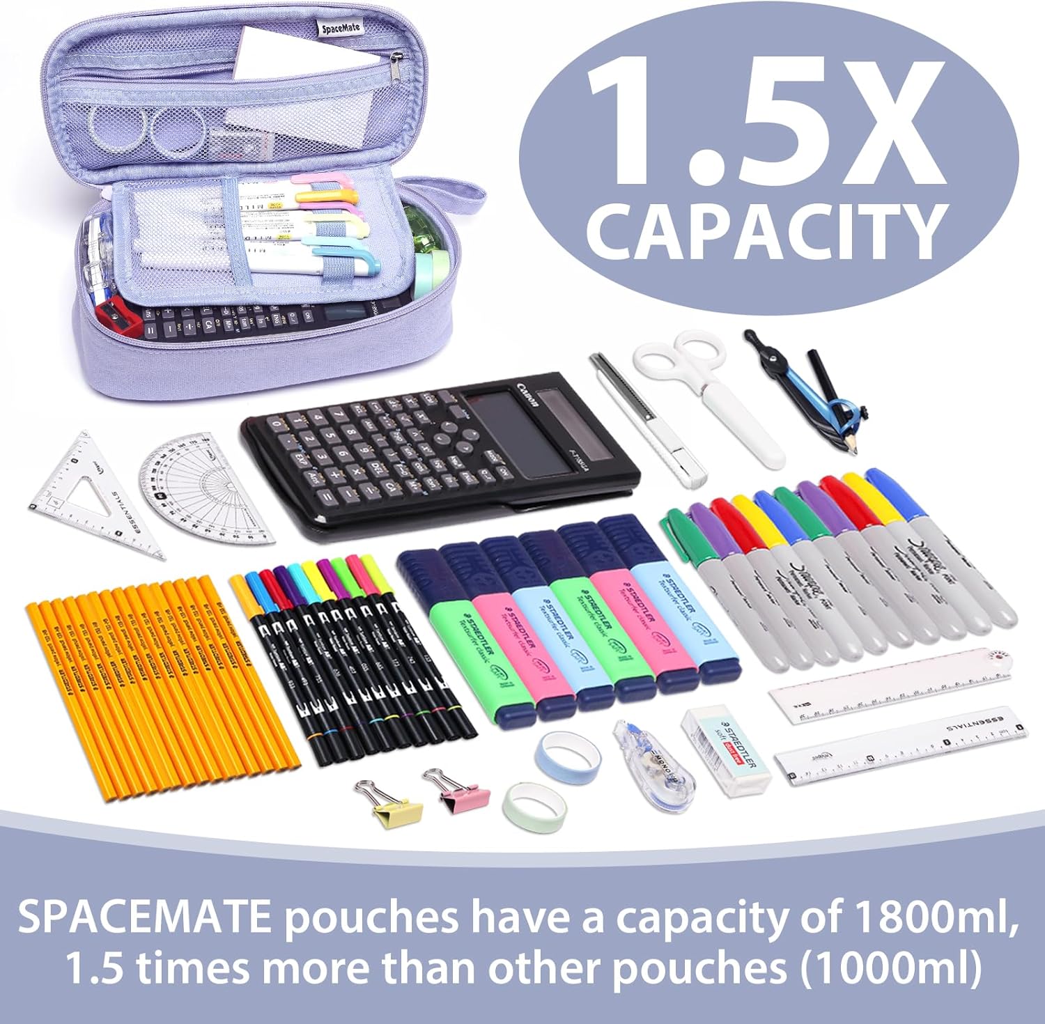 - Large Capacity: The pencil case has a 1.5X larger capacity of 1600ml compared to others, making it easy to store 50-100 pencils and other school supplies like markers, rulers, and notebooks.