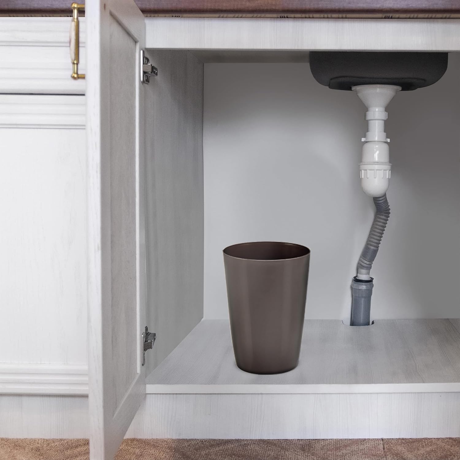 - COMPACT TRASH CAN: The design makes it ideal for small spaces. Perfect for next to toilet, shower, under cabinets, sinks, desks, and other places in need of a small garbage can. The sleek design makes it a perfect office trash can as well