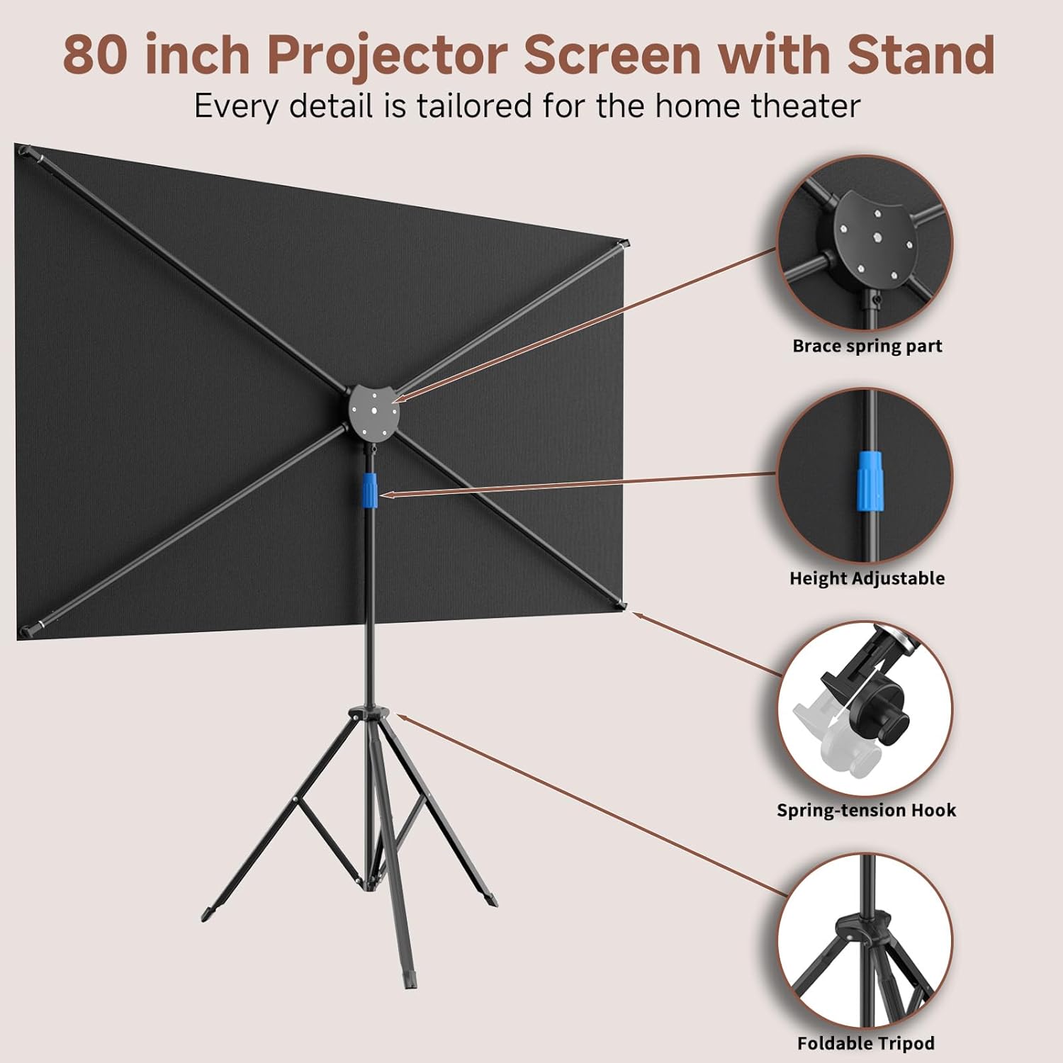 - 80 INCH PROJECTOR SCREEN: The tripod for the projector screen with stand is made of sturdy metal with a thick main pole and 4 sturdy diagonal poles, and four aluminum tubes with spring tension at the end to keep the entire projector screen structure stable, solid and flexible, with free height adjustment.