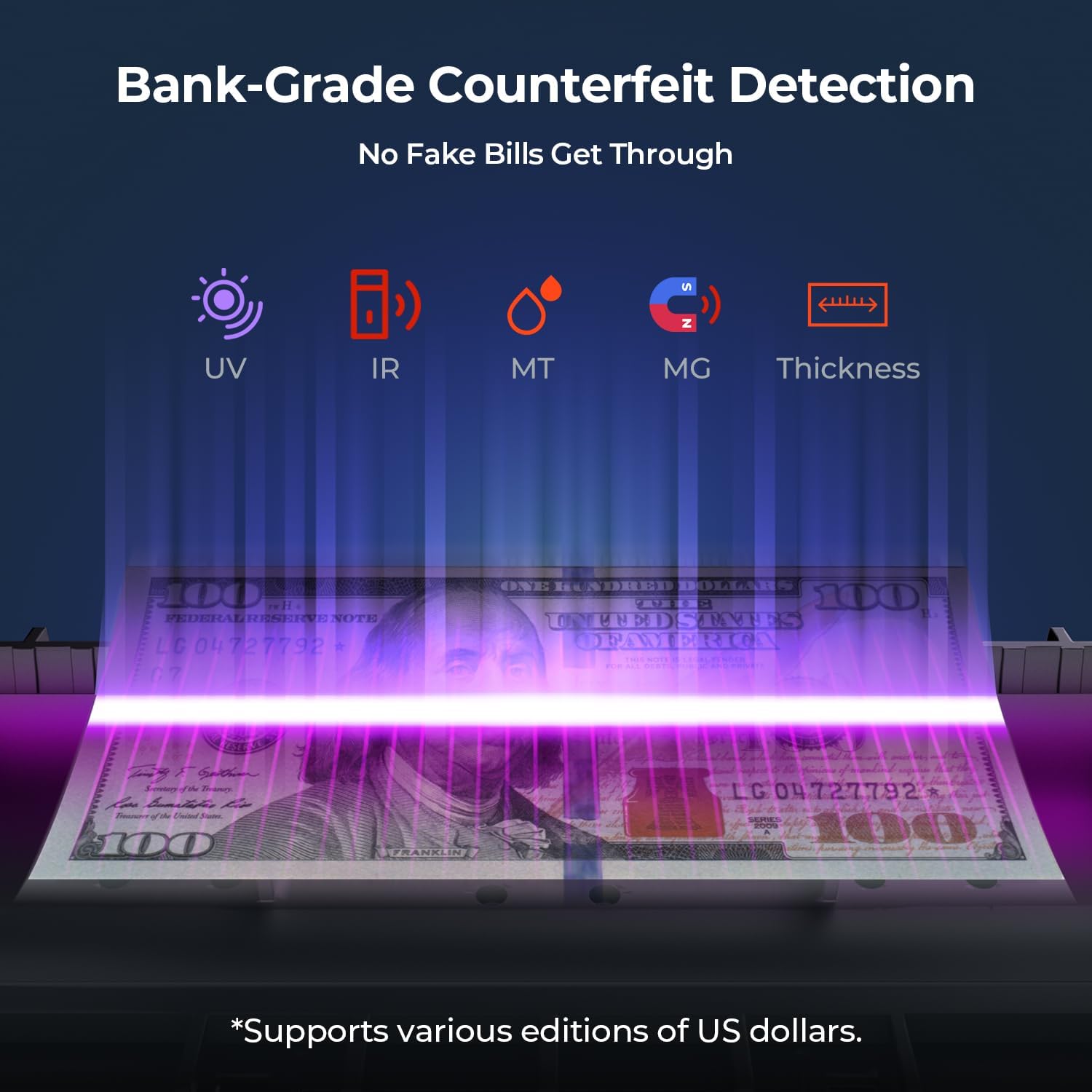 - [Precise Detection] This currency counter uses UV/IR/MG/MT detecting technology to examine the bills using Magnetic, Infrared, Ultraviolet, Dimensional, Thickness, Security Line, Variable Ink, Spectrum, and Fluorescence Detection techniques to completely protect your company from false bills.