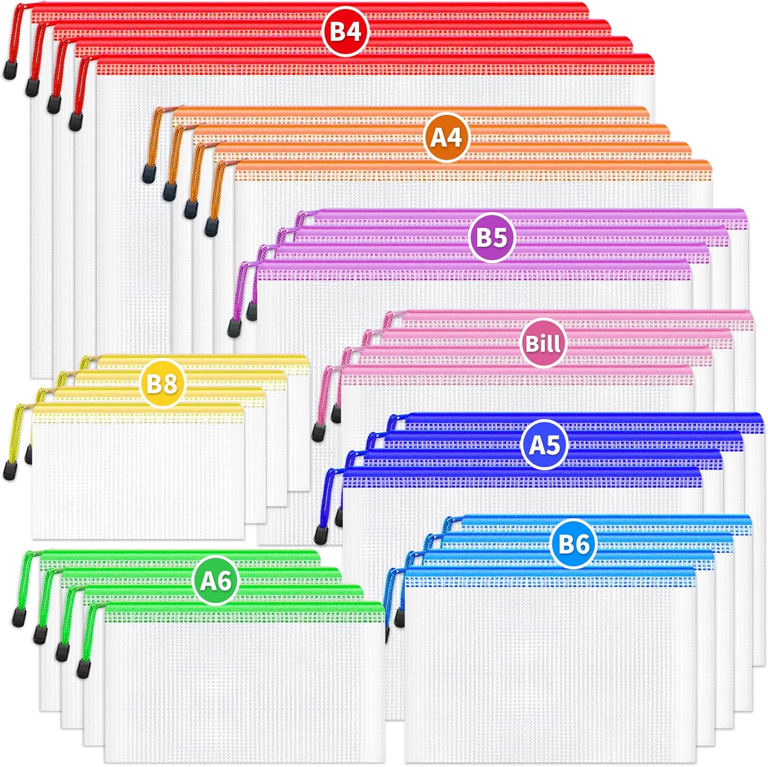 - 【PACKAGE CONTENT】The package includes 32 mesh zipper pouch with 8 sizes, each size has 4 zipper bags. They are B4 (15×11 inches), A4 (13.4×9.4 inches), B5 (11.6×8.3 inches), A5 (9.5×7.1 inches), Bill size (9.4×4.7 inches), B6 (7.7×5.5 inches), A6 (7.1×4.7 inches), B8 (5.1× 3.9 inches)