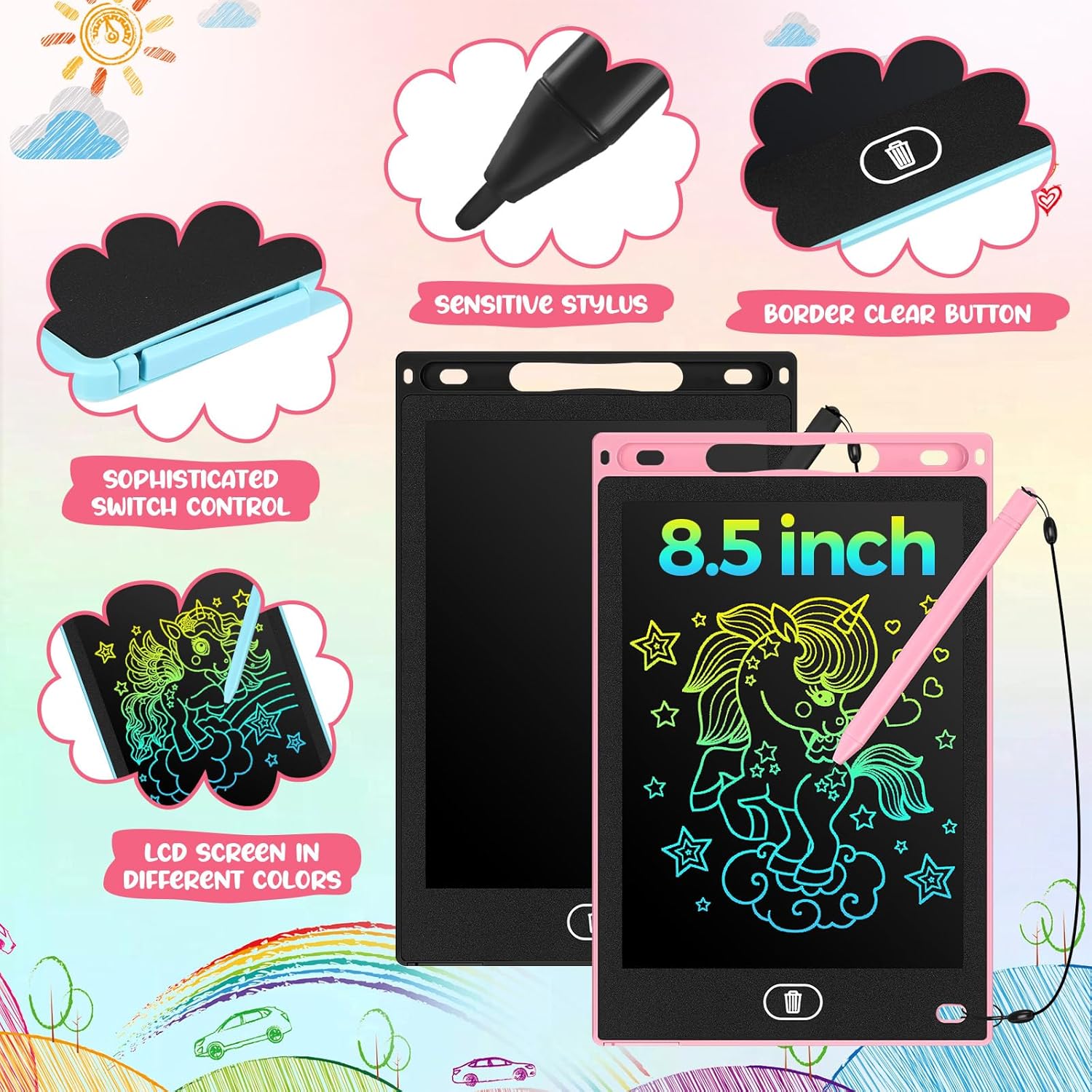 - Eye Protection LCD Screen: this doodle learning board has a 8.5 inch multicolor LCD screen which can protect your boy's vision while provide a more comfortable drawing experience; Therefore, there is no need to worry about this will injury your eyes, but can let you enjoy the freedom of creation while releasing their imagination; Please pull out the small plastic sheet next to the battery then you can use it to write or draw