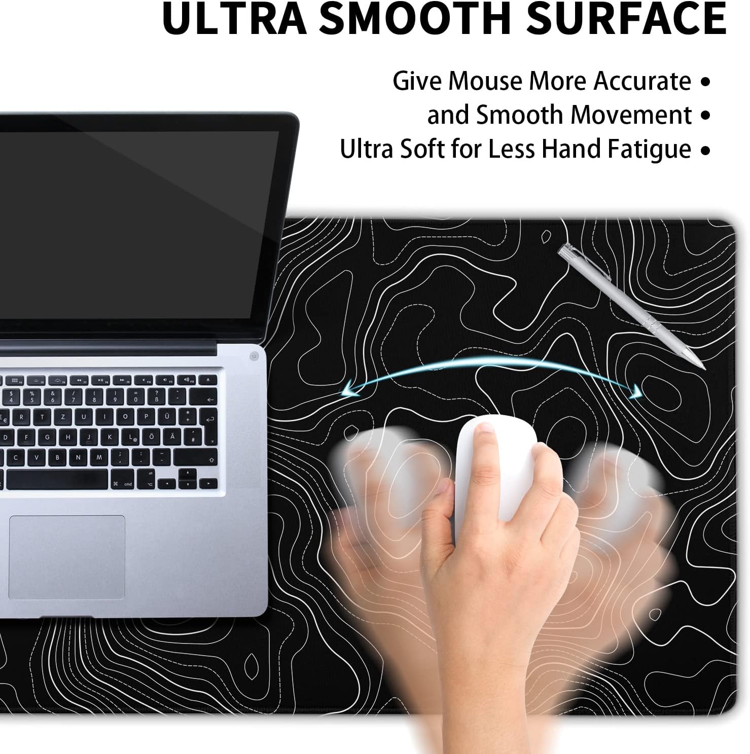 - ★【Superior Control Surface】:Black topo geographic map lines computer large mouse pad designed with superfine fiber braided Material,smooth surface will provide you with frustration-free mouse movement.The performance-tuned keyboard pad greatly enhances control accuracy and speed in working or gaming.
