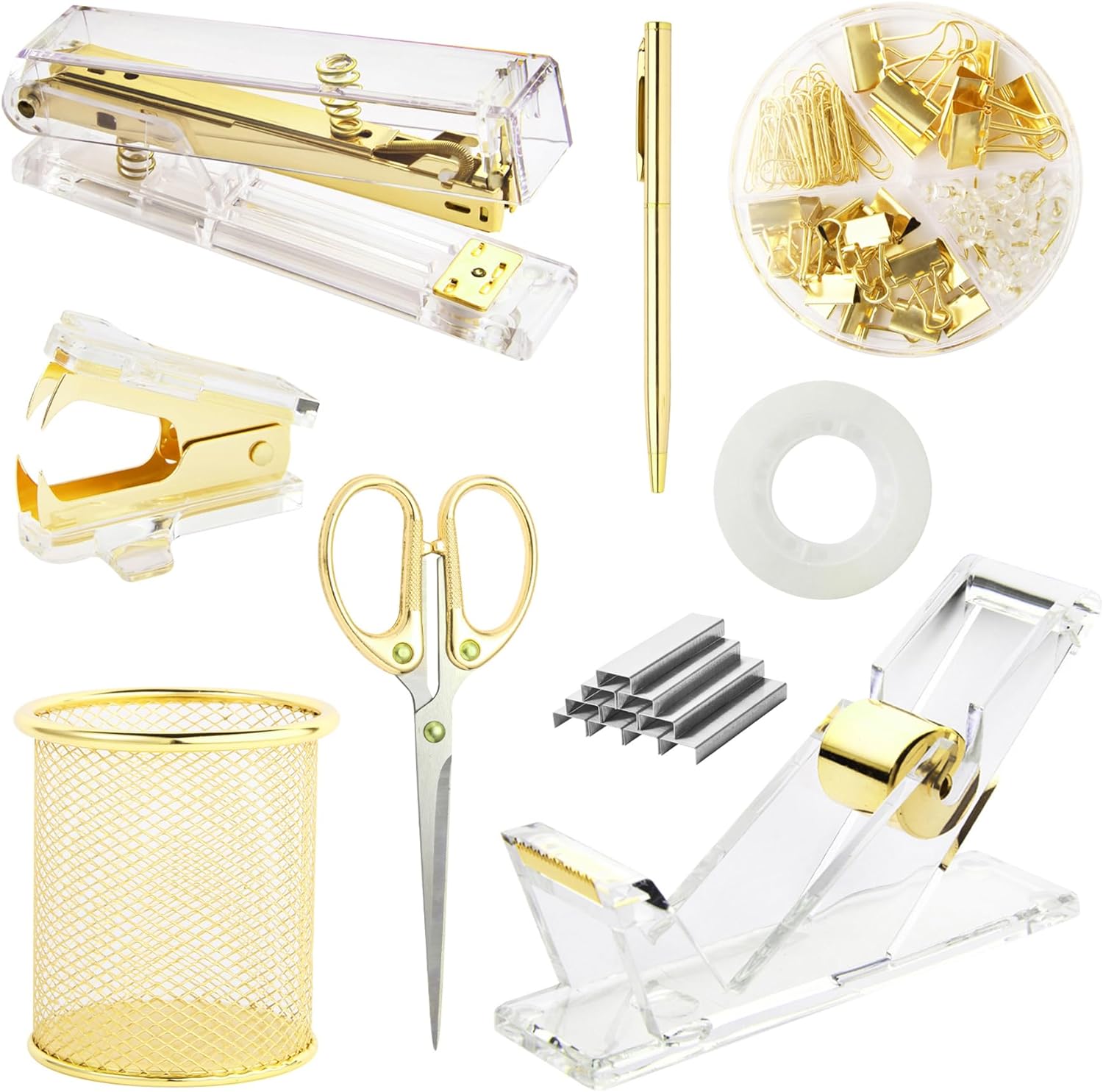 Gold Desk Accessories, Office Supplies Set with Acrylic Stapler, Tape Dispenser, Staple Remover, Pen Holder, Scissor, Binder Paper Clips, 1 Ballpoint Pen, 1 Clear Tape and 1000pcs Staples