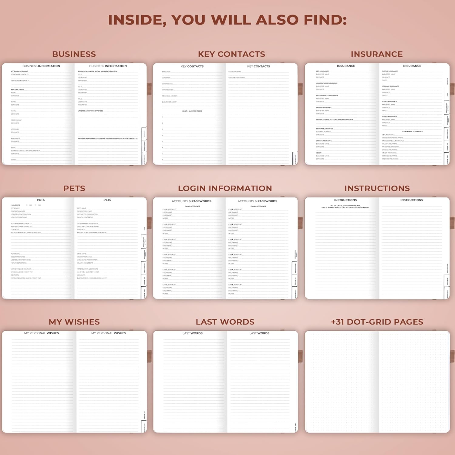 - PREPARE DETAILED INSTRUCTIONS TO GUIDE YOUR LOVED ONES: This guided final arrangements planner is an easy-to-use tool for organizing all essential personal information, from medical data to passwords and financial records.