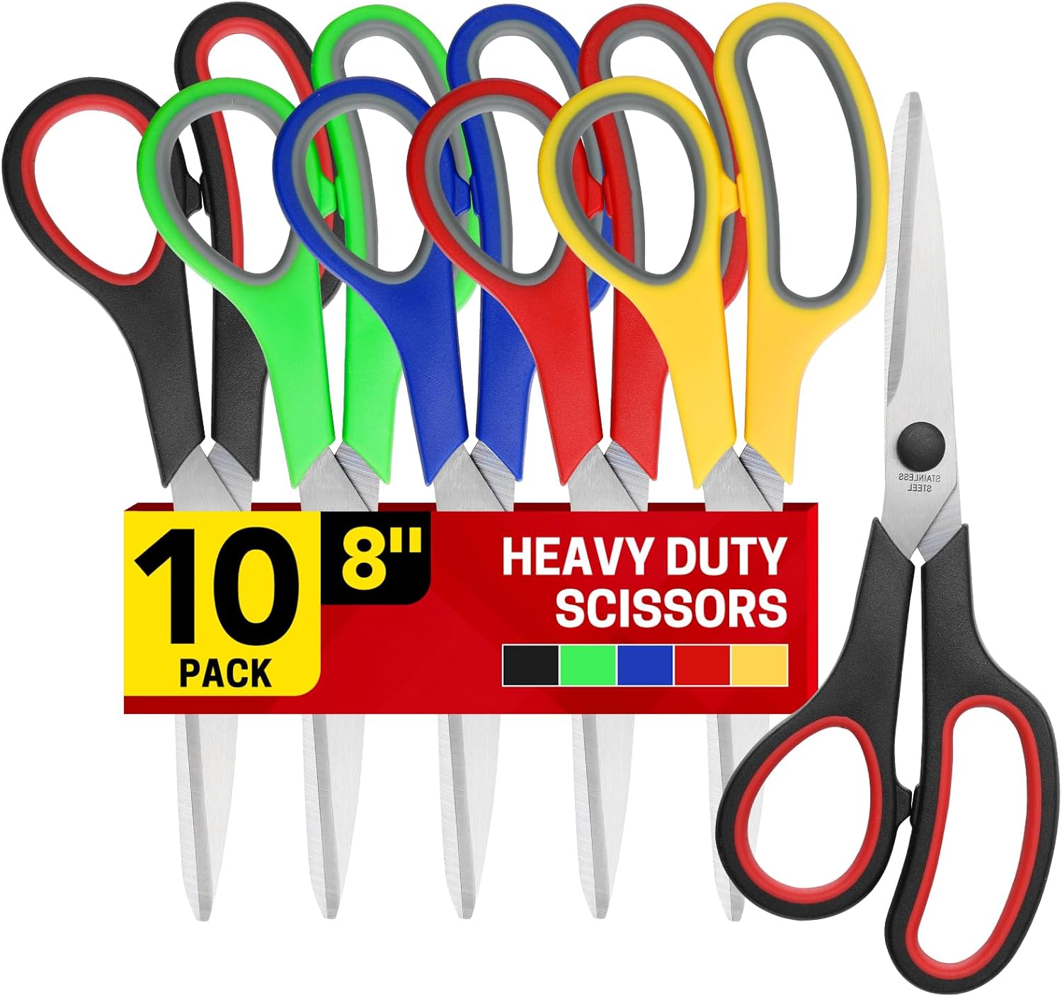 8" 10 Pack All Purpose Heavy Duty Scissors- Comfort-Grip Sharp Scissors for Office School Sewing Fabric Craft High/Middle School Student Teacher Scissor, Right/Left Hand