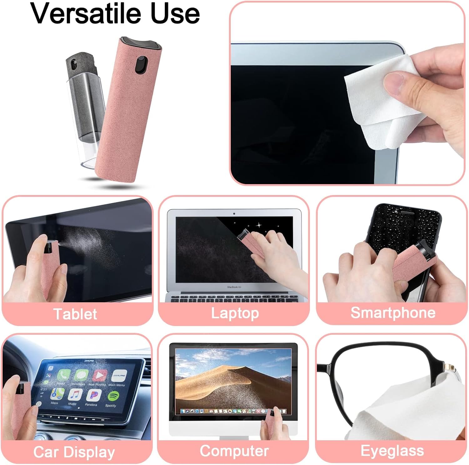 - Screen Cleaner Mist and Microfiber Fiber Cloth for Electronics: They are cleaning. Easy to remove the oil and fingerprint from the screen of cell phone, tablet PC, laptop, indicator, TV, iPad, iPhone, Macbook, watch, monitors, e-Readers, Kindle car displays screen; the glass of eyeglasses, sunglasses, the lens of the camera, etc.